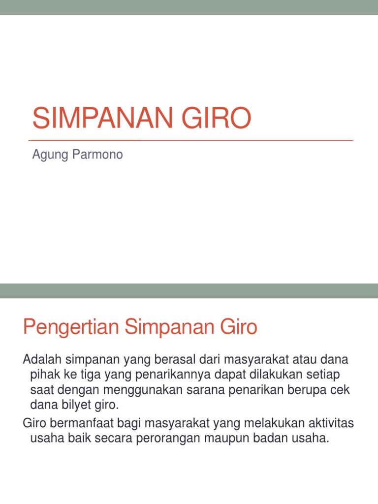 Kepada setiap pemegang rekening giro akan diberikan bunga yang dikenal dengan nama jasa giro. Simpanan deposito adalah simpanan yang penarikannya hanya dapat dilakukan pada waktu tertentu berdasarkan nasabah perjanjian nasabah penyimpanan. Giro adalah simpanan pada bank yang penarikannya dapat dilakukan setiap saat dengan menggunakan cek atau surat perintah pembayaran lain atau dengan cara pemindahbukuan. Pengertian giro (demand deposit) pengertian simpanan giro atau yang lebih populer disebut rekening giro menurut uu perbankan no. Pengertian giro adalah simpanan pada bank yang penarikannya dapat dilakukan setiap saat dengan menggunakan cek atau surat perintah pembayaran lain atau dengan cara pemindahbukuan.